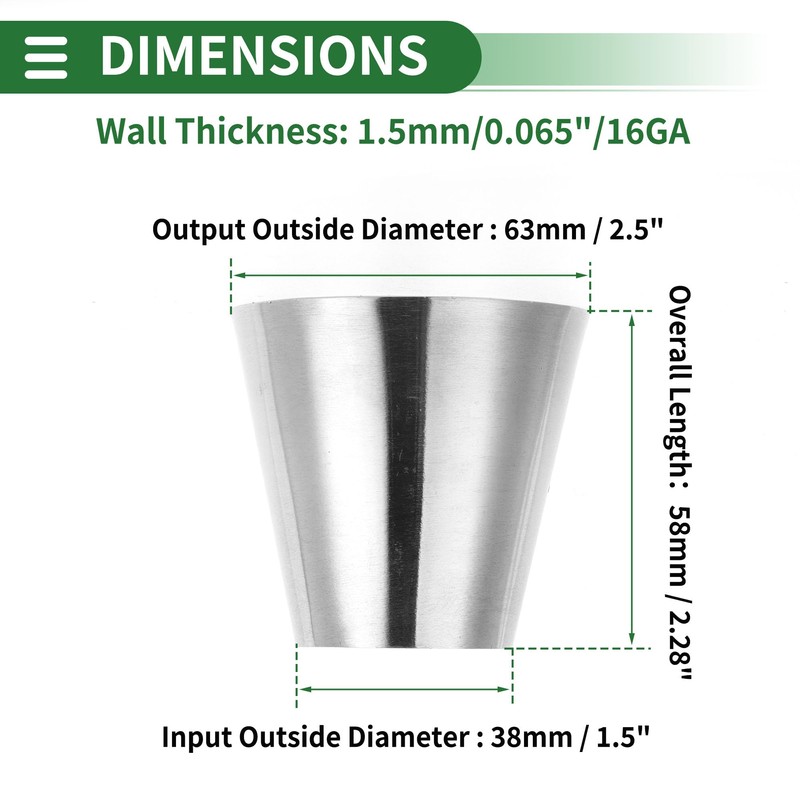 - Feature:Pipe Type: Input Outside Diameter: 38mm / 1.5"; Output Outside Diameter: 63mm / 2.5"; Overall Length: 58mm / 2.28"; Wall Thickness: 1.5mm/0.065"/16GA