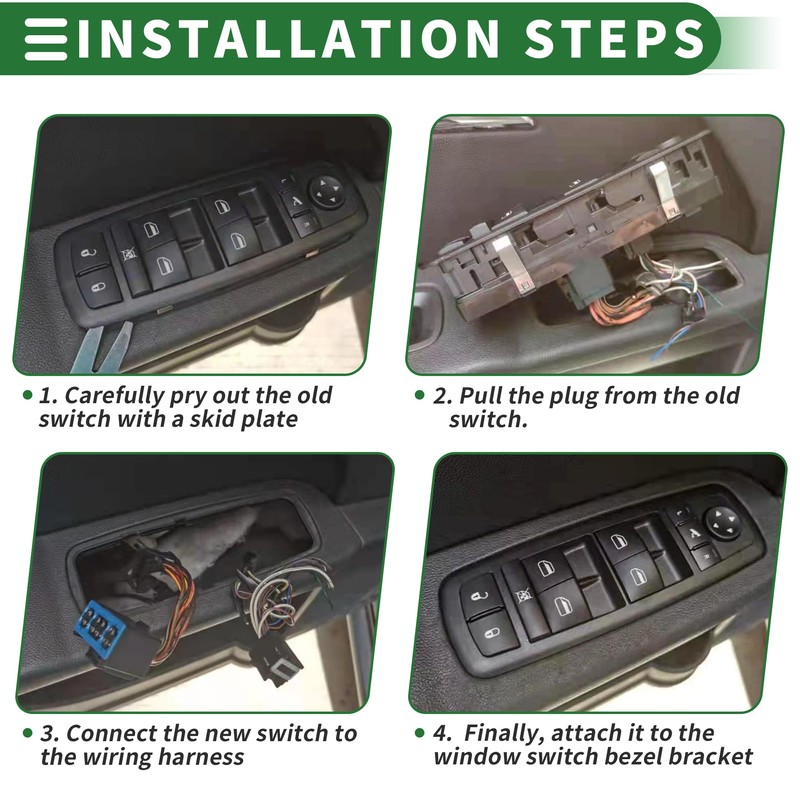 - Installation Guide:Easy to Install: Turn off the power before installation. Please pay attention to the mating plug before installing the switch, and clean the excess dust. Installation Step: 1. Carefully pry out the old switch with a skid plate; 2. Pull the plug from the old switch; 3. Connect the new switch to the wiring harness; 4. Finally, attach it to the window switch bezel bracket.