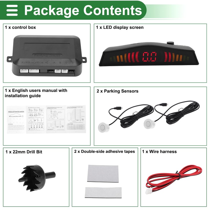 - What You Get:This parking sensor system includes 2 precision sensors, a control box, and a LED display screen.