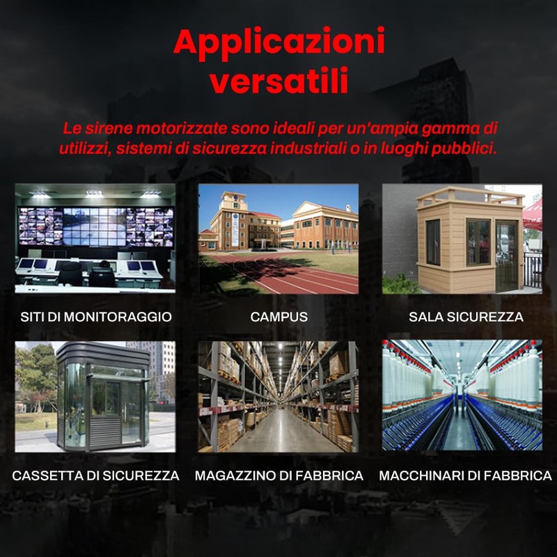 - VERSATILE APPLICATIONS Ideal for factories, warehouses, campuses, businesses, residential areas, public places and more. Electric motor alarm is easy to install, just connect two wires to the power supply, and then install the base firmly with screws