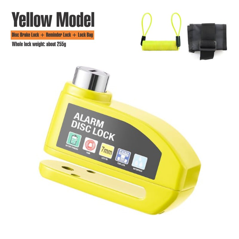 - ✅Motorcycle Alarm Disc Lock Wheel 7mm Pin Zinc Alloy Security Tamperproof, Heavy Anti-theft Waterproof Padlock 110dB with Cable & 2 Keys Bike Bicycle Scooter.✅HIGH END: High-security motorcycle disc brake lock featuring a double locking mechanism and a 7mm hardened steel locking shaft. An optional alarm function can also be activated.