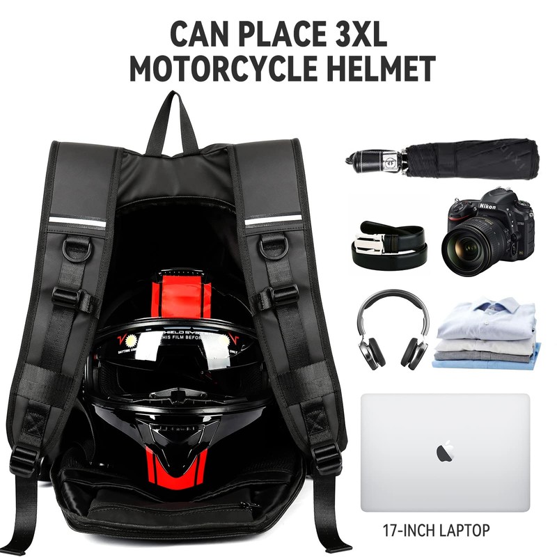 - 【Waterproof Helmet Backpack】This motorcycle backpacks for men women is made of high quality water resistant material. The waterproof helmet backpack can protect your belongings from water or rain and you can use it on rainy days. And the pack is super lightweight and will save you extra weight while riding.