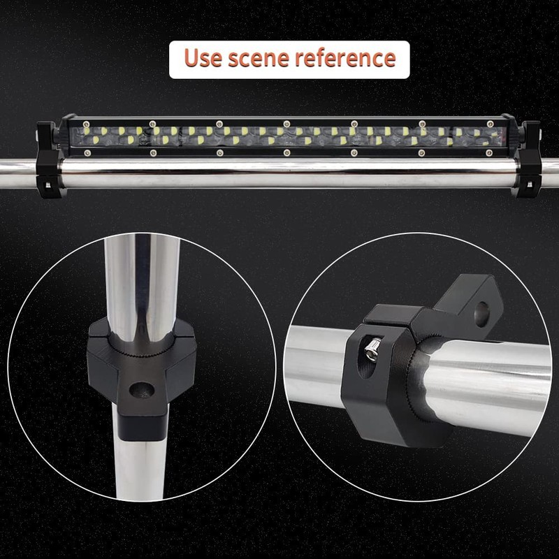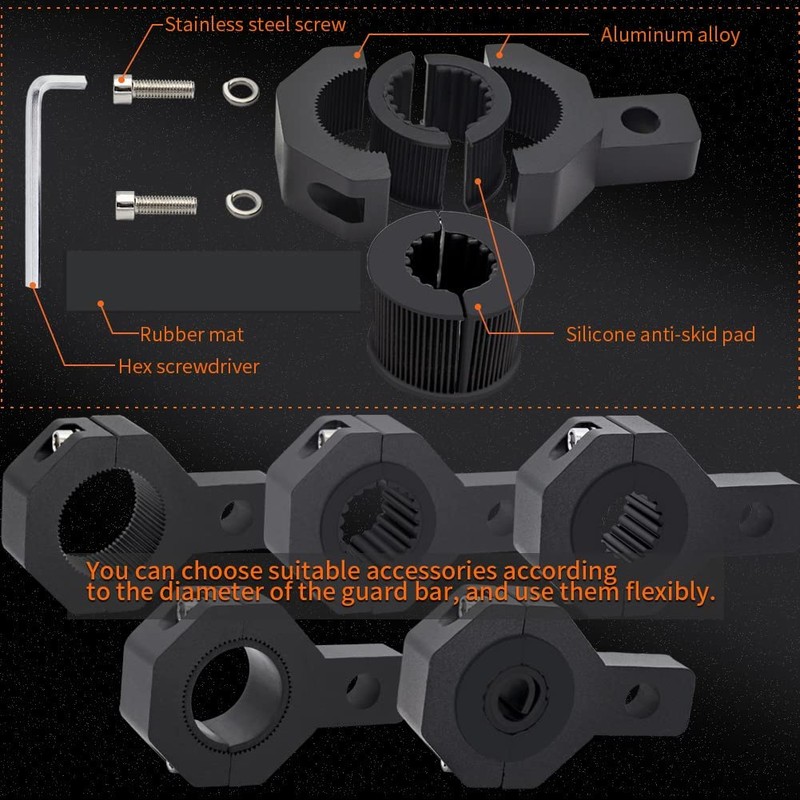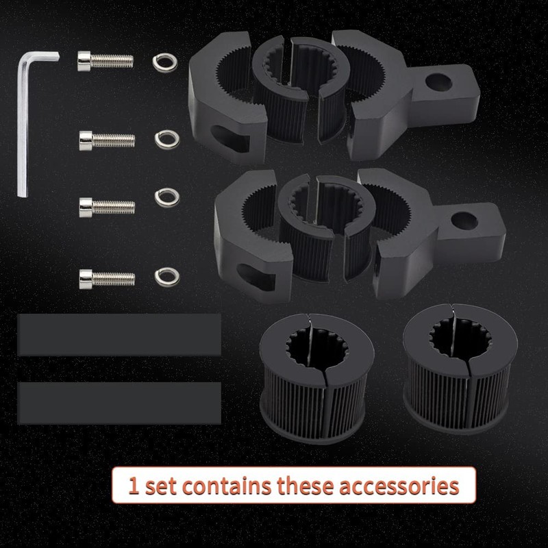 applicable to motorcycle handlebar spotlights and fog lights mounting brackets. motorcycle brackets tube clamp mount kit can work with most LED,HID,halogen spotlights/fog lights/driving lights or light bars. apply to most offroad vehicles, cars, trucks, boats, farm vehicles, etc.It could be hangon the tubes, bull bar, roll cage, etc.