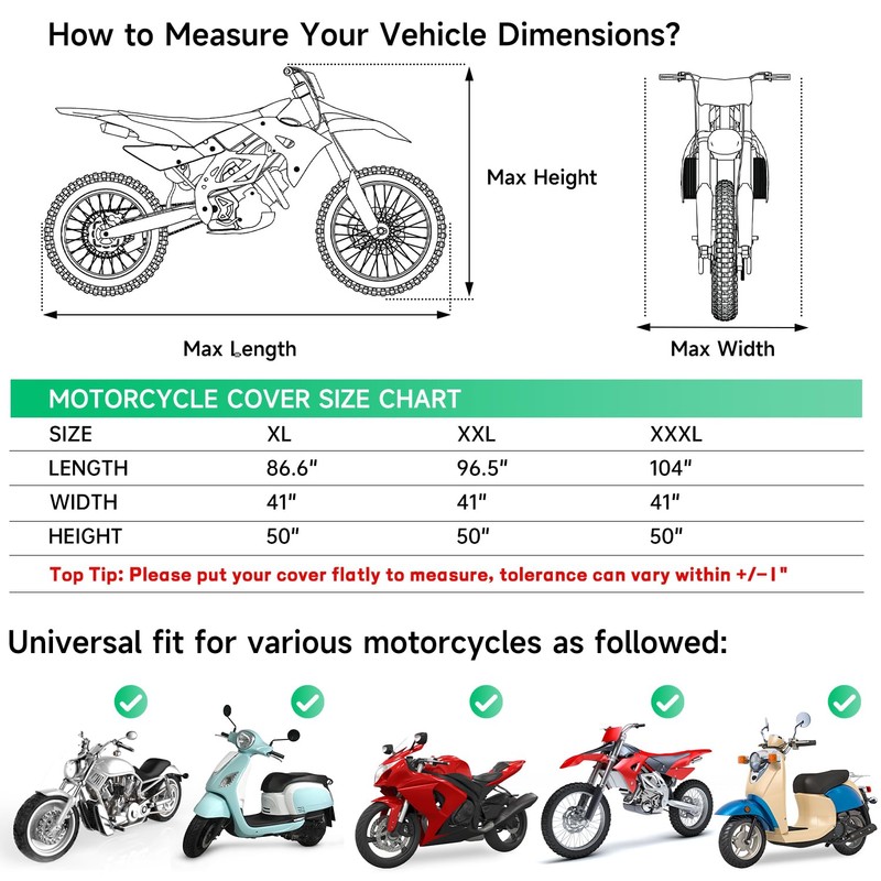 • [ UNIVERSAL FIT ] – Favoto motorcycle cover is universal and fits various motorcycles. Fits up to 86.5” in length motorcycles.