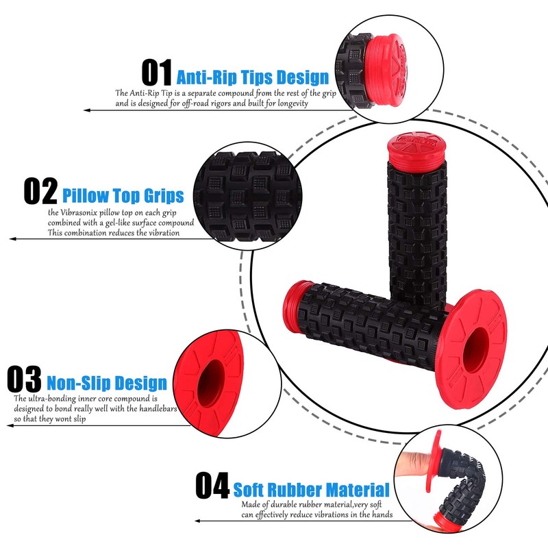 - 🏍GRIPS FUCTION:Dirt bike hand grips can reduces vibration and cushions hard impacts,relieve your hands fatigue,and the pillow top hand grips have a self-cleaning pattern,it's especially great for MX when you don't have time to stop and clean your hand grips