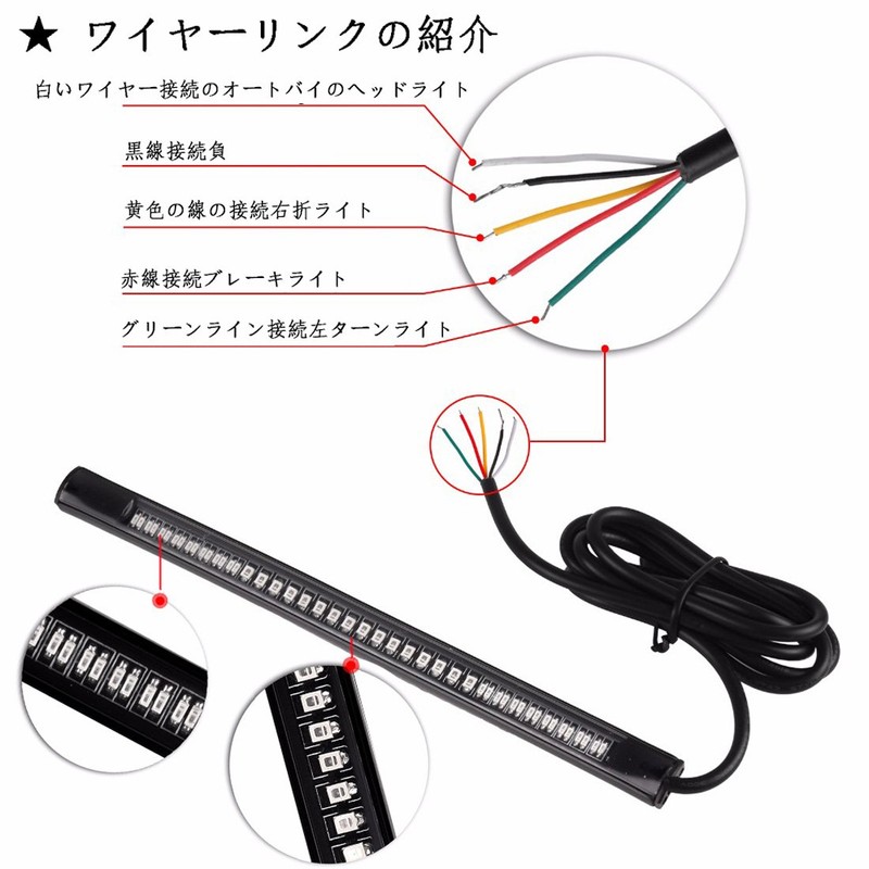 - 【Easy to Install】 - White wire connected motorcycle headlight, black wire connection negative, yellow wire connecting right turn light, green line connection left turn light, red wire connection brake light