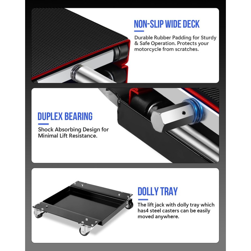 - Anti-Slip Protection: The extra-wide lifting platform features deep-groove rubber padding to securely grip motorcycle frames without slipping or scratching. The textured surface keeps your bike locked in place during crucial maintenance work.