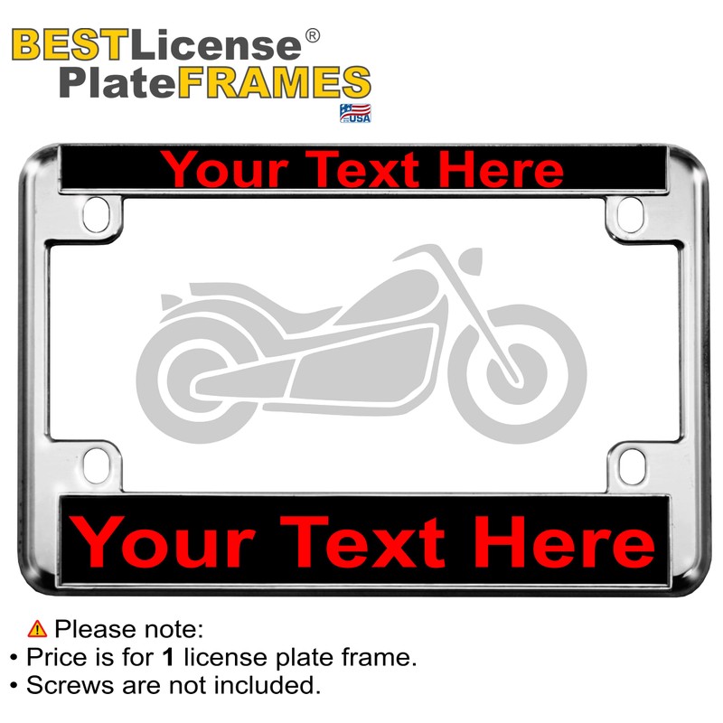 Motorcycle Personalized Chrome Metal (Zinc) Laser Engraved Standard Size License Plate Frame with Custom Text Design - Black/Red Text