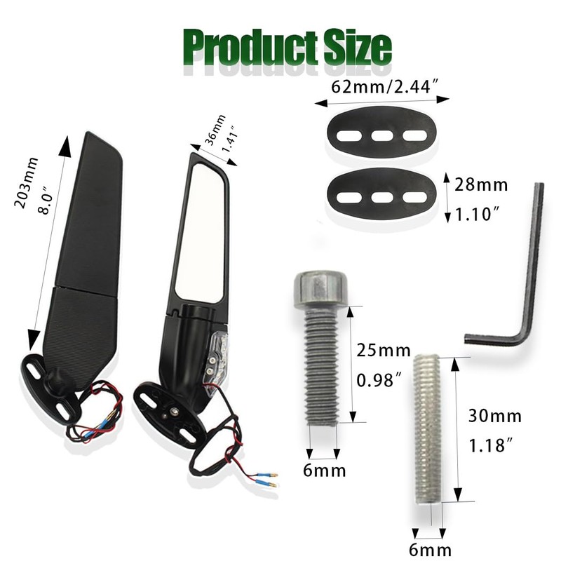 - 【Adjustable Rotating Stealth Mirrors with LED】Zx6RR turn signal lights wing rearview mirrors are designed with 360° rotation that you can flexibly adjust the angle of rotating stealth mirrors. LED wing side mirrors feature convex glass surface and turn signal lights to provide a clear and wide field of vision even in extreme condition to ensure your driving safety.