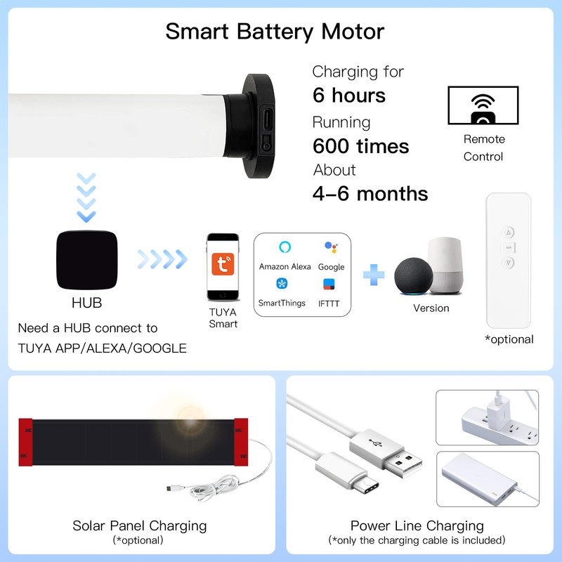 - 【Excellent Motor】Motorized blind uses rechargeable tubular motor, which can be connected Alexa and Google through the hub (the hub needs to be purchased separately). The motor is charged by a lithium battery, which has a long battery life. It can be used for 4-6 months on a single charge, so you don't have to worry about the battery running out. For higher installation locations, there is also the option of using solar panels for charging.(NOTE:Hub is not included in the package.)