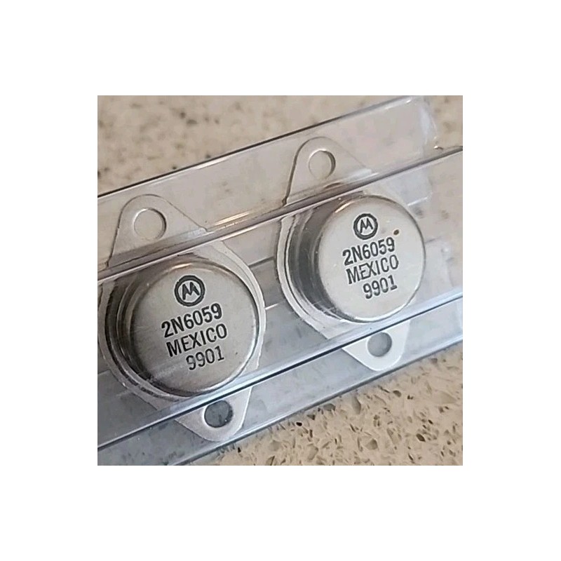 The product is a set of two Motorola 2N6059 NPN Silicon Power Transistors. These power transistors are designed for high current and voltage applications, making them ideal for use in various electrical and electronic systems. These transistors offer reliable performance for a wide range of industrial and commercial applications.