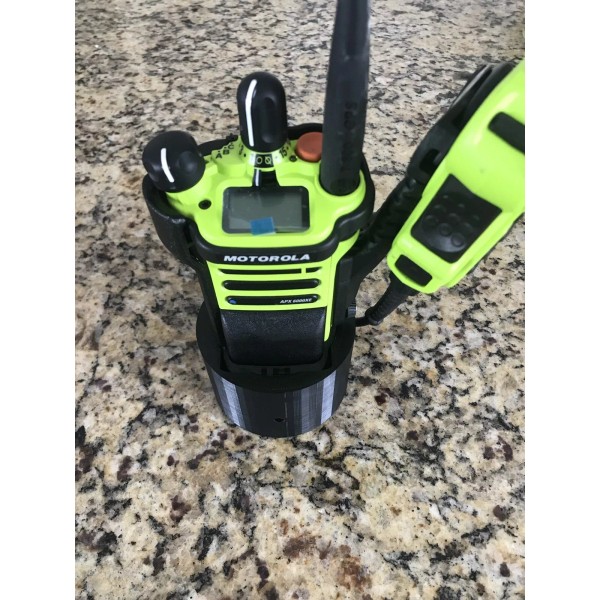 We developed this Motorola APX6000/7000 xe holder to either mount with flat head screws, double sided tape or in a cup holder. This provides a good place to stow your portable radio to provide protection and accountability.