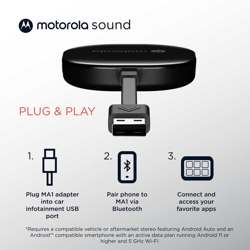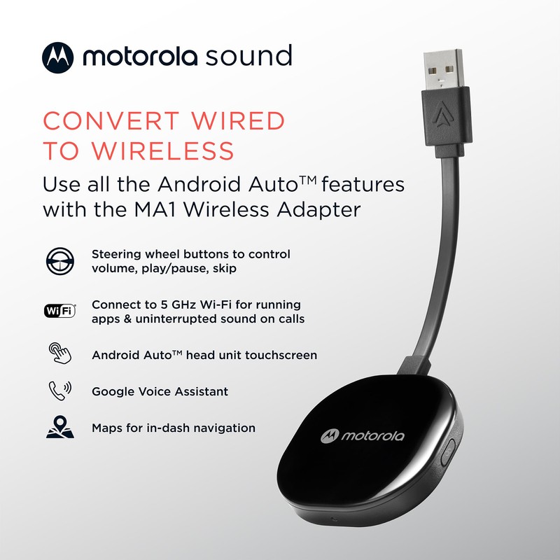 Motorola Sound MA1, The Only Google Authorized Wireless Android Auto Car Adapter, Smartphone to Screen Wireless Bridge Car Accessories, USB Type-A