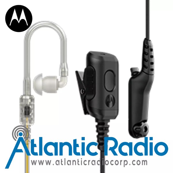 The Motorola PMLN8342 is 2-wire surveillance kit with one wire for receiving transmissions and a second wire with a combined microphone, programmable button and Push-To-Talk button. The clear tube earpiece is replaceable with quick disconnect and supports loud audio features enabled by the device. UL approved.