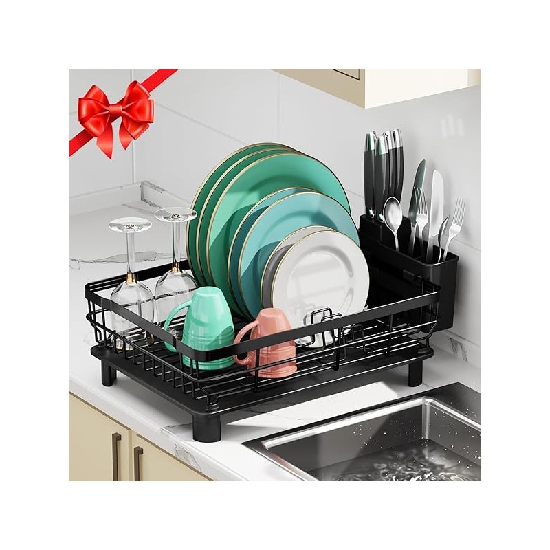MOUKABAL Dish Drying Rack, Dish Rack, Stainless Steel Dish Racks for Kitchen Counter, Dish Drainer with Removable Utensil Holder, Drainboard (Black)
