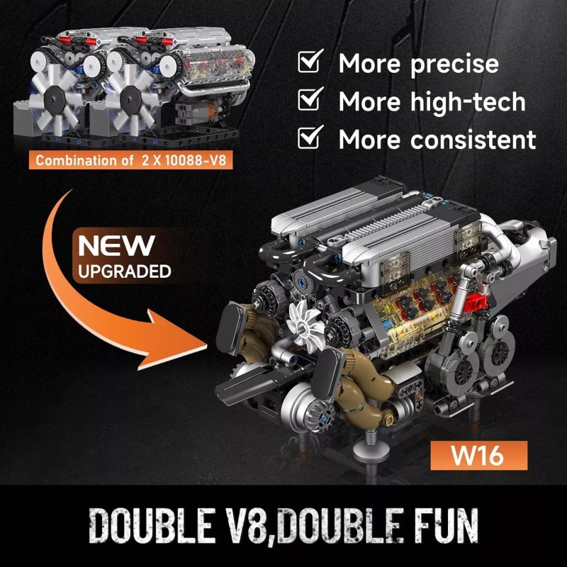 - 【Build Your Own Engine Model】 This W16 engine is Tight-Fitted V8 Engine, which is 2*V8 engine combination that arranged in a W-shape. The W16 engine is the most popular technic engine for supercar enthusiasts and fans, which equipped with 16-cylinder 8-Liter 4-turbochargers, delivers tremendous power output.