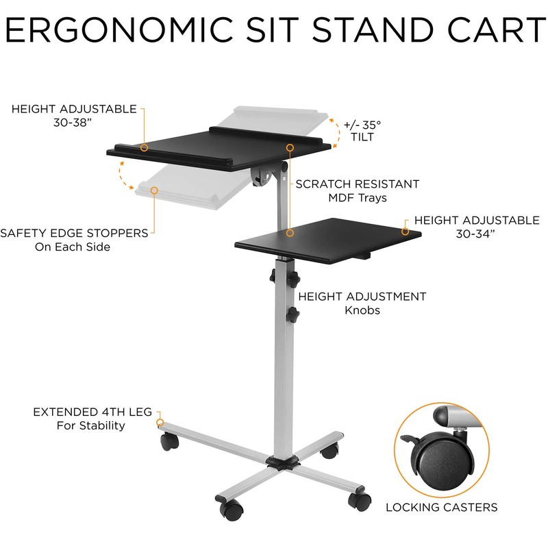 - ADJUSTABLE HEIGHT ROLLING DESK - Lift and lower the height of the platforms to your needs. Height of each platform individually adjusts between 30 to 34 inches.