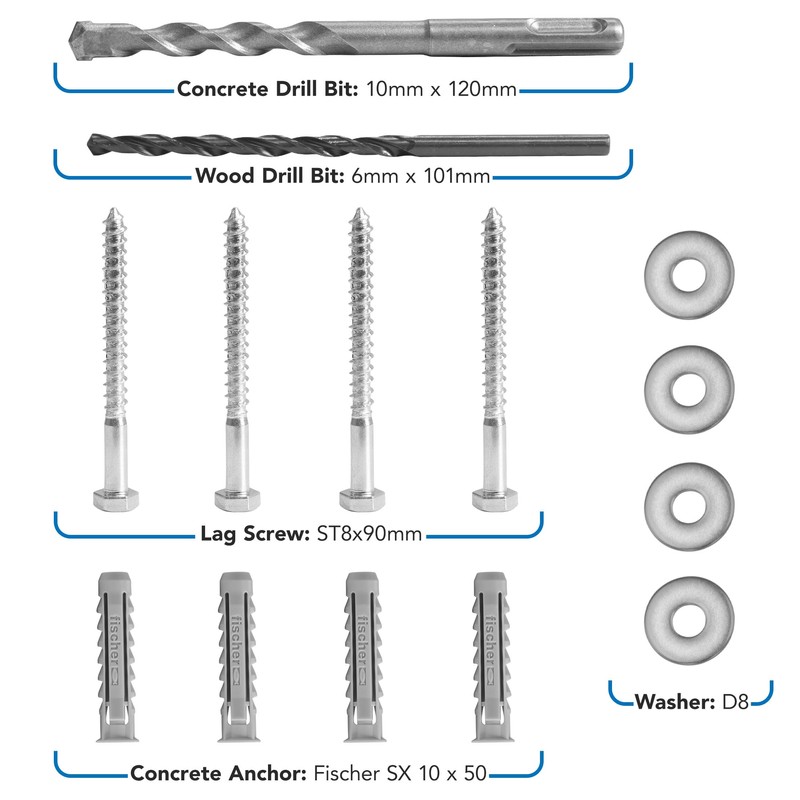- THIS KIT INCLUDES: This universal TV mount hardware kit includes 4 screws (ST8x90mm), 4 washers (D8), 4 Fischer concrete anchors (SX 10 x 50), 1 wood drill bit (Ø6mm x 101mm) and 1 concrete drill bit (Ø10mm x 120mm)