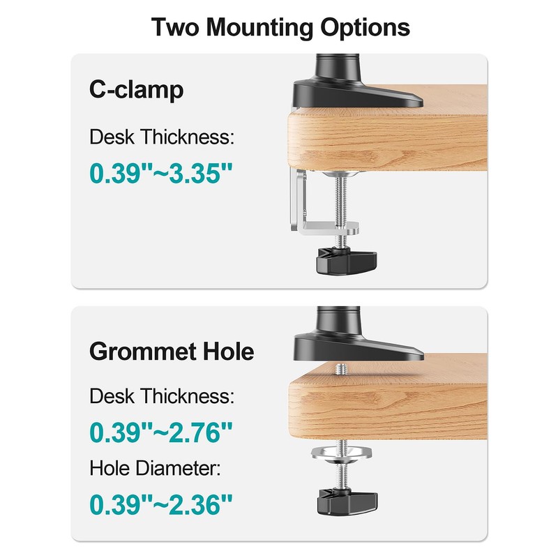 - Effortless Installation-Equipped with clear manual and mounting hardware needed. You can choose drill-free c-clamp mounting (suitable for desks from 0.39 to 3.35" thick) or grommet mounting (suitable for desks from 0.39 to 2.76" thick)