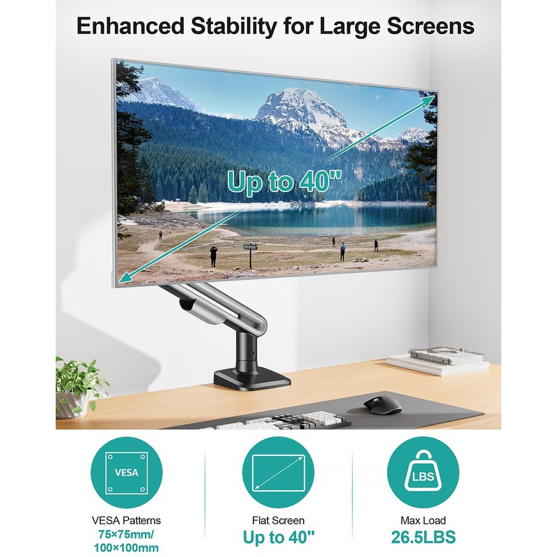 MOUNT PRO Single Monitor Desk Mount for Max 40 Inch Screens, Adjustable Gas Spring Monitor Arm Holds up to 26.5lbs, Computer Monitor Stand with Clamp and Grommet Base, VESA Mount 75x75mm/100x100mm