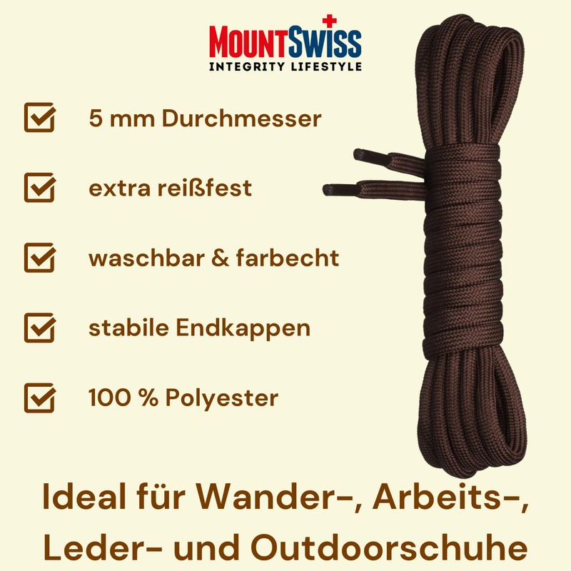 • In addition, an internal reinforced fibre ensures a long durability. The shoelaces are designed for use in trekking and work shoes and can also be used under difficult conditions. But also in mountaineering, hiking, trekking, leather, outdoor and casual shoes, our Mount Swiss Premium laces provide a reliable grip when tying your shoes.