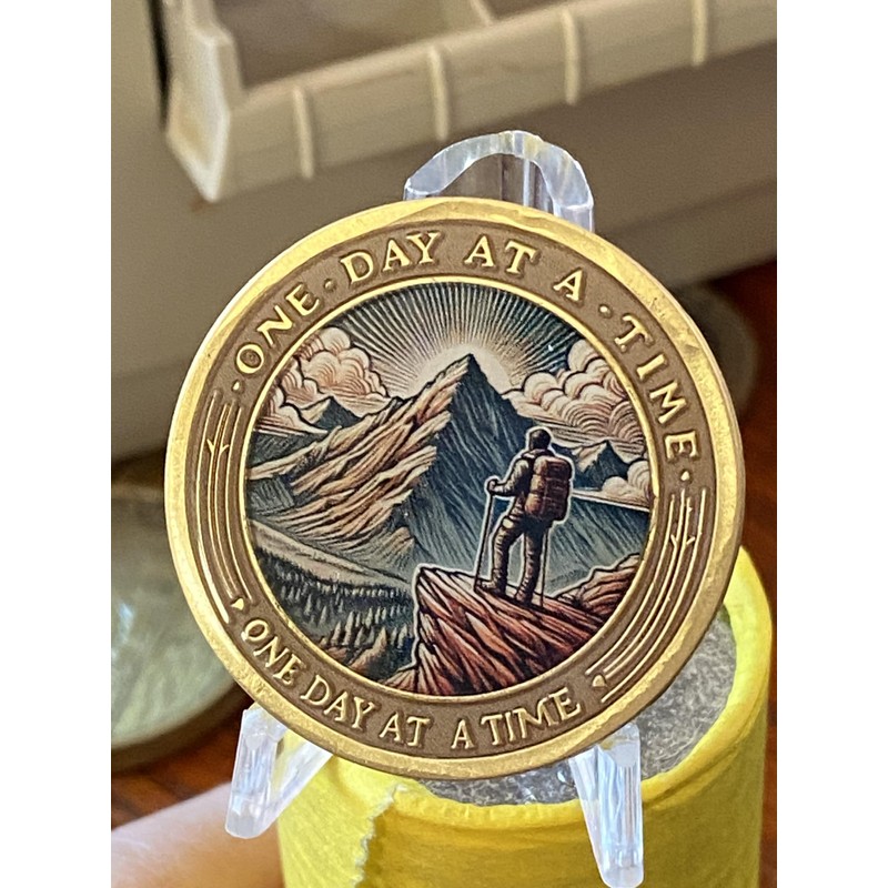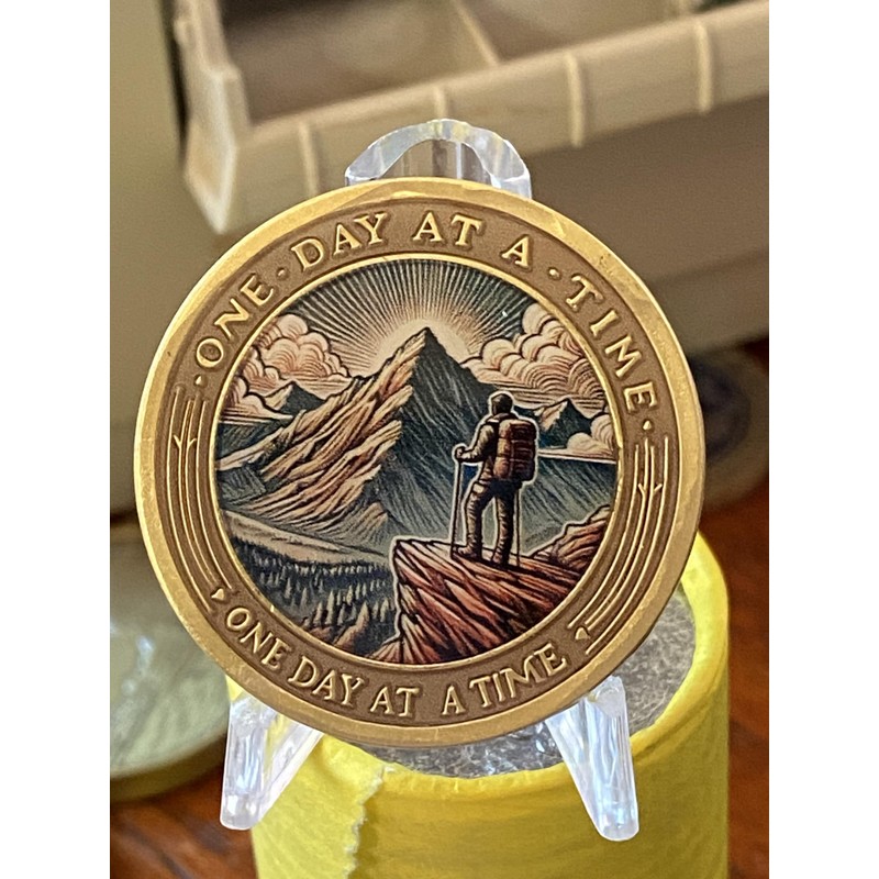 Mountain Climber Man One Day at A Time Medallion Serenity Prayer Chip