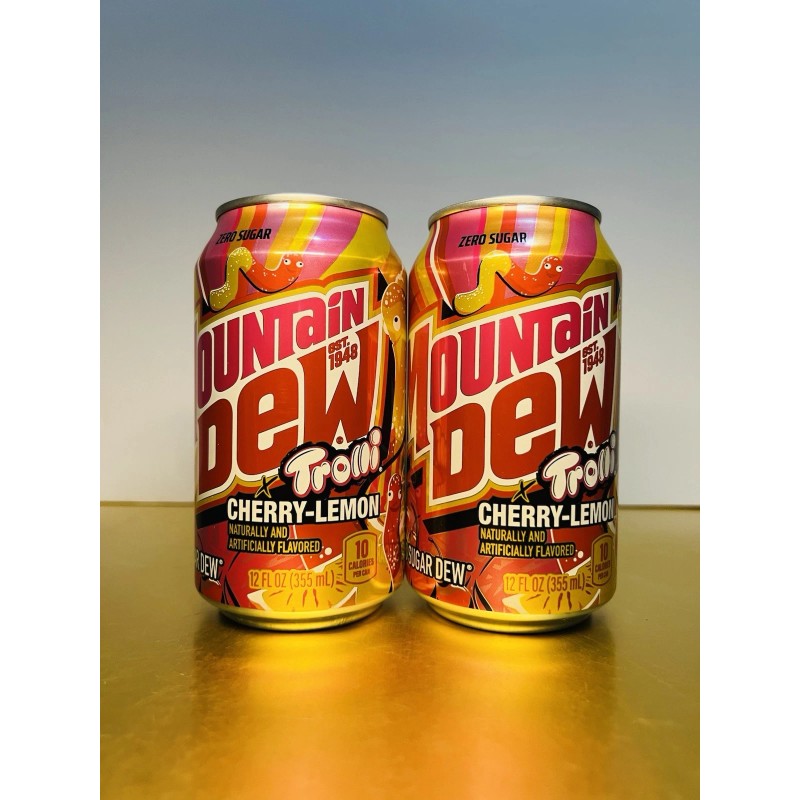 The product is a limited edition Mountain Dew Zero Sugar TROLLI Cherry Lemon Soda, consisting of two cans. This soda is made with lime and cherry flavor, with the intention of being zero sugar. It is manufactured in the United States and has an expiration date of 12-28-25. It falls in the pantry food aisle and is categorized as a soft drink. Perfect for those looking for a unique and flavorful experience with their soda consumption.