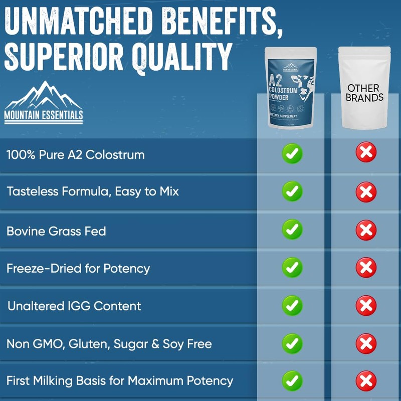 MOUNTAIN ESSENTIALS A2 Colostrum Powder 3.5 Oz Bovine Grass Fed Above 40% IGG Gluten Free, Non GMO 1 Year Shelf Life 50 Servings Pack of 1