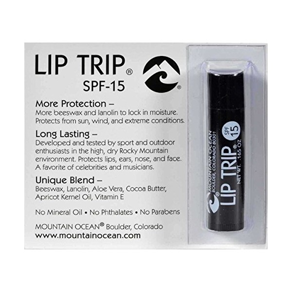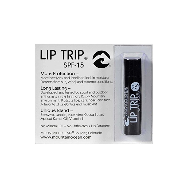 Mountain Ocean Lip Trip was developed and tested by sport and outdoor enthusiasts from the high-altitude Rocky Mountain environment to the tropical exposure of the Caribbean and South Pacific.Last Three Times Longer - 100% beeswax base (no petroleum products) locks in moisture base. Leaves lips smooth and soft. Maximum Protection - Protects lips, nose and face from sun, wind and extreme conditions. Mountain Ocean Lip Trip was developed and tested by sport and outdoor enthusiasts from the high-altitude Rocky Mountain environment to the tropical exposure of the Caribbean and South Pacific. Beeswax varies in consistency depending on temperature. Free Of Contains No: PABA or Mineral Oil. Disclaimer These statements have not been evaluated by the FDA. These products are not intended to diagnose, treat, cure, or prevent any disease.