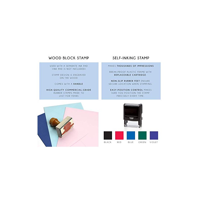 - WHAT'S INCLUDED - You can choose between a Wood Block Stamp or a Self-Inking Stamp. The size of each option is 1 x 2 inches.