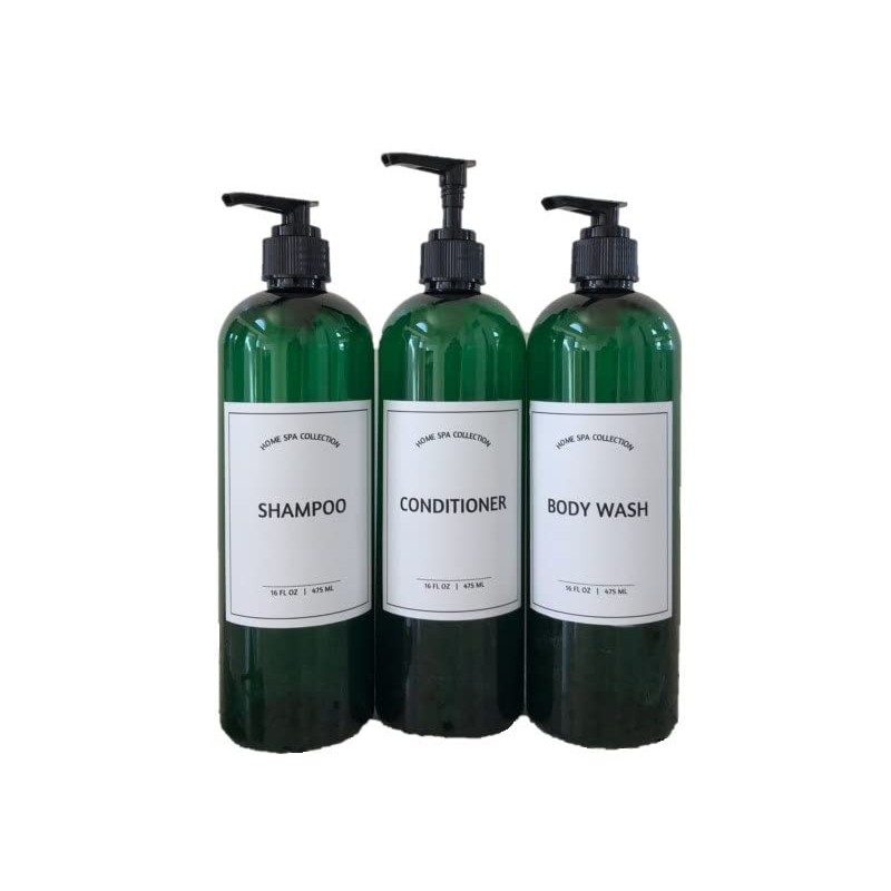 - 16 oz. empty PET plastic cosmo round pump bottles with printed polyester waterproof labels, shampoo, conditioner and body wash ~ Set of 3.
