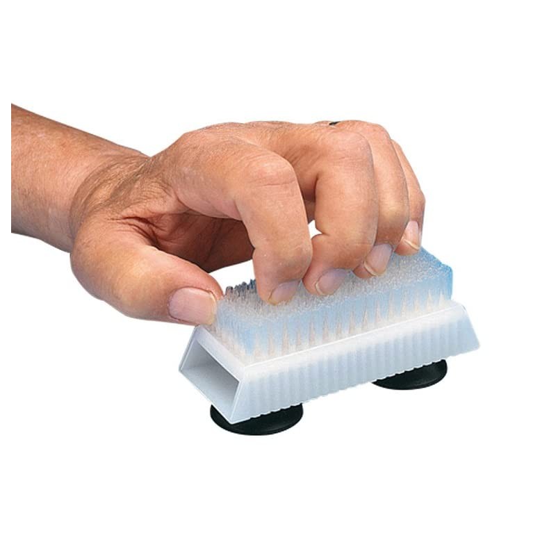 The Mounted Nail Scrub Brush has two large suction cups that hold the brush in place for cleaning fingernails for one handed users. The half inch soft nylon bristles are set in durable plastic. This adapted nail cleaning brush can be secured to any flat, smooth surface in a kitchen or bathroom. This personal hygiene brush helps users clean their finger nails with one hand. The base of the brush is made of plastic and has two suction cups attached. The rubber suction cups on the lightweight plastic base help secure the brush. The Mount Nail Scrub Brush personal hygiene aid allows individuals to easily wash items using one hand.