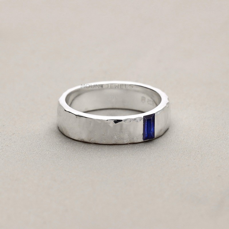 MOUNTJEWELS Sapphire Mens Ring 925 Sterling Silver Blue Sapphire Ring Wedding Band Ring Promise Ring Hammered Ring Mens Promise Ring Jewelry Gift Wedding Engagement Band