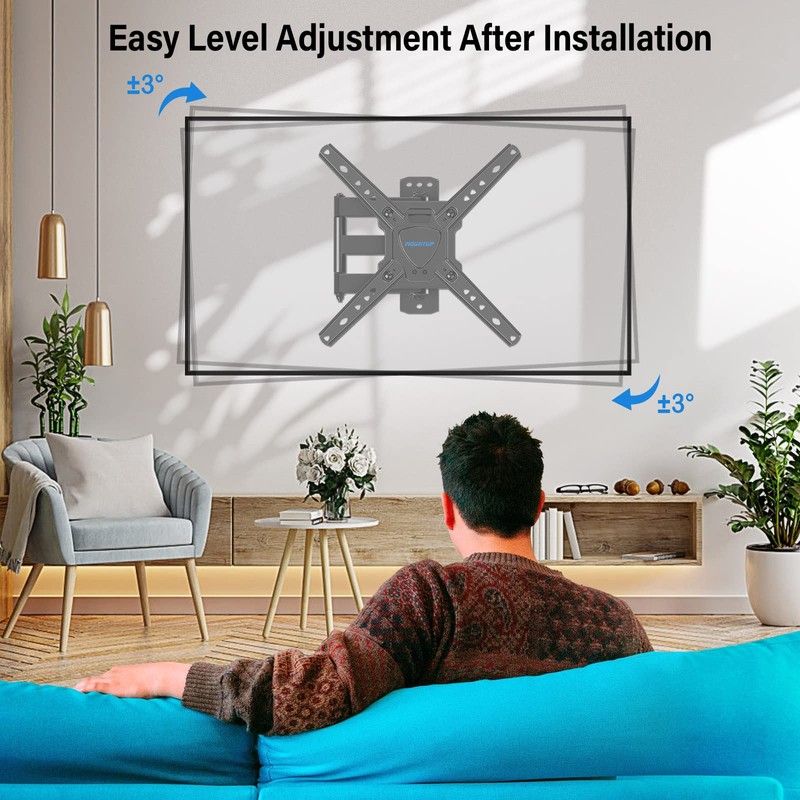 - Full Motion TV Mount- This TV mount features swivels angle of +/-90°,tilting angle of +5/-15°,level adjustment of +/-3° after installation, you can customize the perfect viewing angle by adjusting the angle.