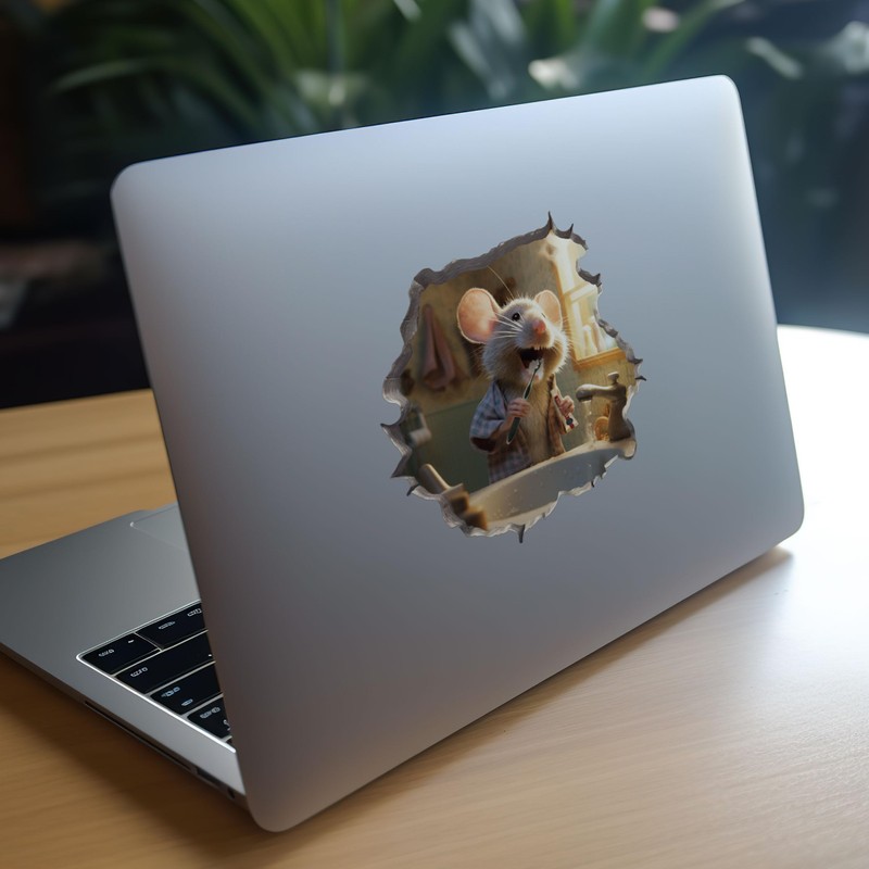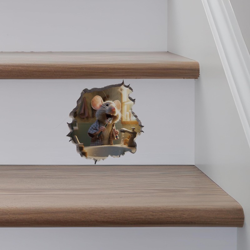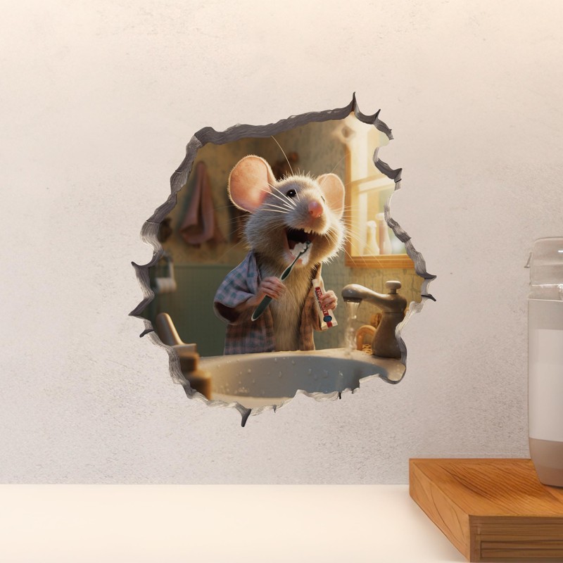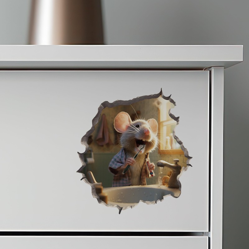 Mouse Brushing its Teeth Mouse in Mouse Hole Decal - Mouse Hole 3D Wall Sticker
