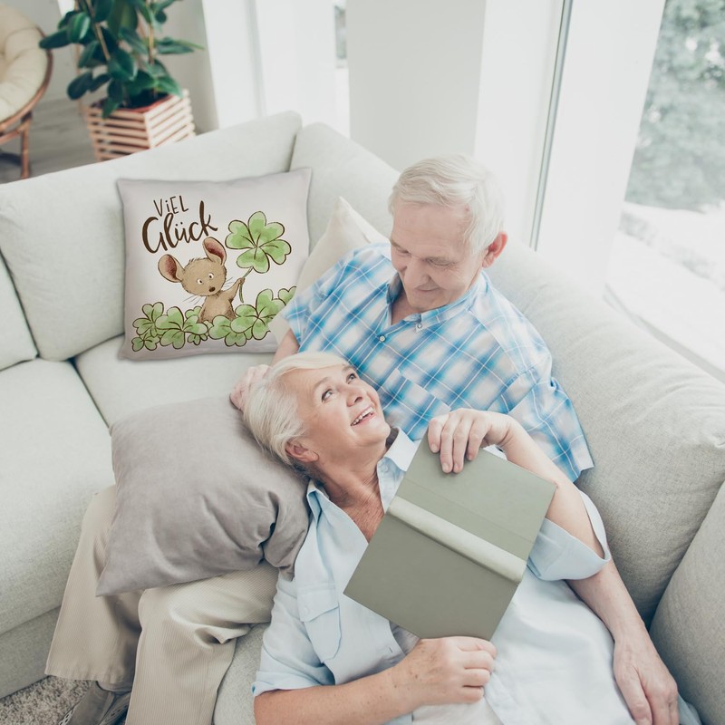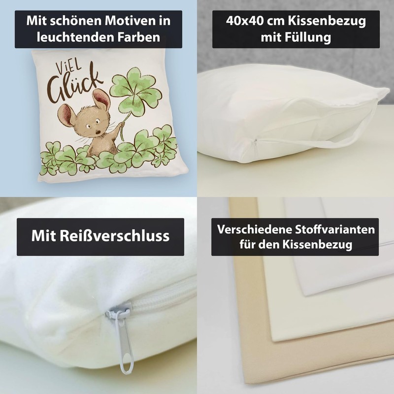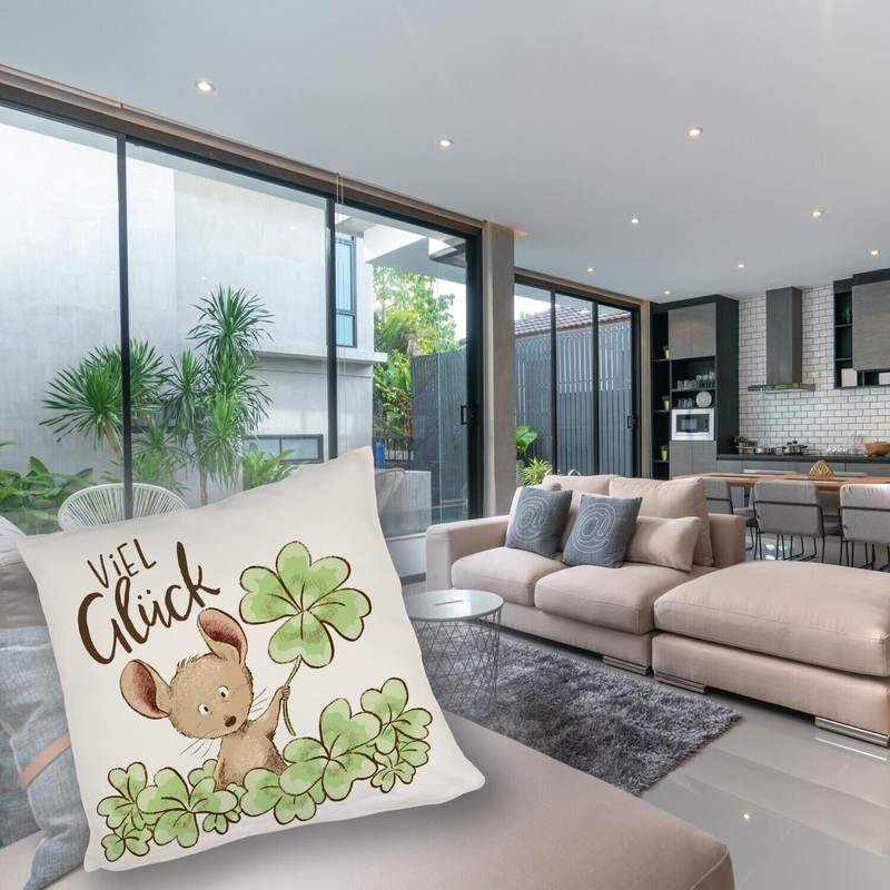 Mouse Cushion with Saying Viel Glück ein Comfortable Decorative Cushion as Lucky Charm Cute Motif Lucky Clover Drawing for Women Cuddly Cushion Cover Printed Sofa Clover Leaf