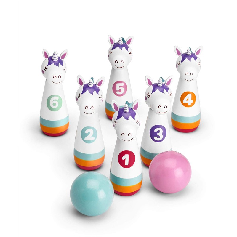 - Not only is this cute Unicorn Bowling Set fun traditional old fashioned wooden toy but it also aids hand and eye co-ordination.
