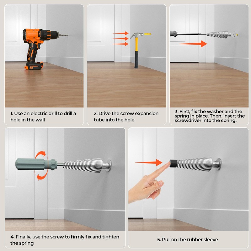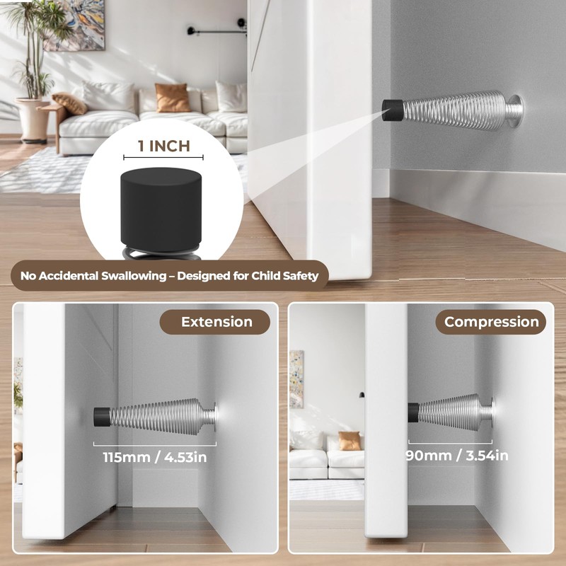 - 【Widely Used】The spring door stopper is made of high-strength metal materials. It has a length of 4.5 inches and can be compressed to 3.5 inches. It is designed for built-in installation, with no exposed mounting screws, presenting a nice and modern look that matches well with any decor, such as in offices,living rooms,bedrooms,bathrooms, patios, hotels, schools, garages, etc.