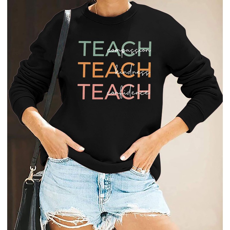 - FEATURES: Round neck long sleeve sweatshirt, funny teacher graphic, teach compassion kindness confidence letter print shirt, kindergarten teachers gift shirt, group teacher sweashirts, inspirational teach shirt, gift for teacher, funny teacher sweater, loose fashion pullover top.