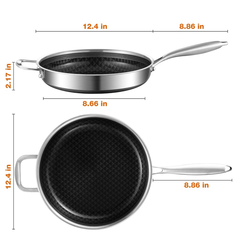 MOUTIUS 12-Inch Non Stick Frying Pans, NonStick Stainless Steel Pan Set, Tri-Ply Skillets and Pan Set with Lid, Induction Cooker Compatible, Cool-Touch Handle, Dishwasher and Oven Safe
