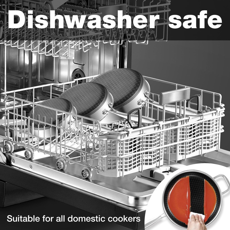 - Full Kitchen Compatibility for Every Cooking Scene:This cooking set works seamlessly with induction cooktops, gas stoves, and ovens, adapting easily to any kitchen environment. Every piece is dishwasher safe, built to endure frequent use, and supports a streamlined, all-in-one cooking experience from prep to cleanup