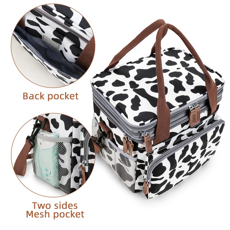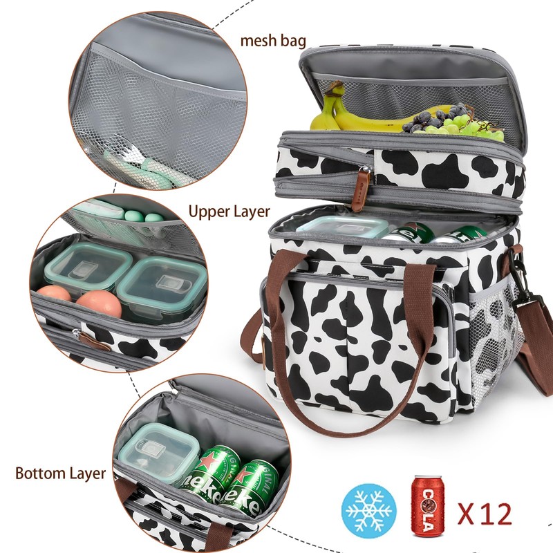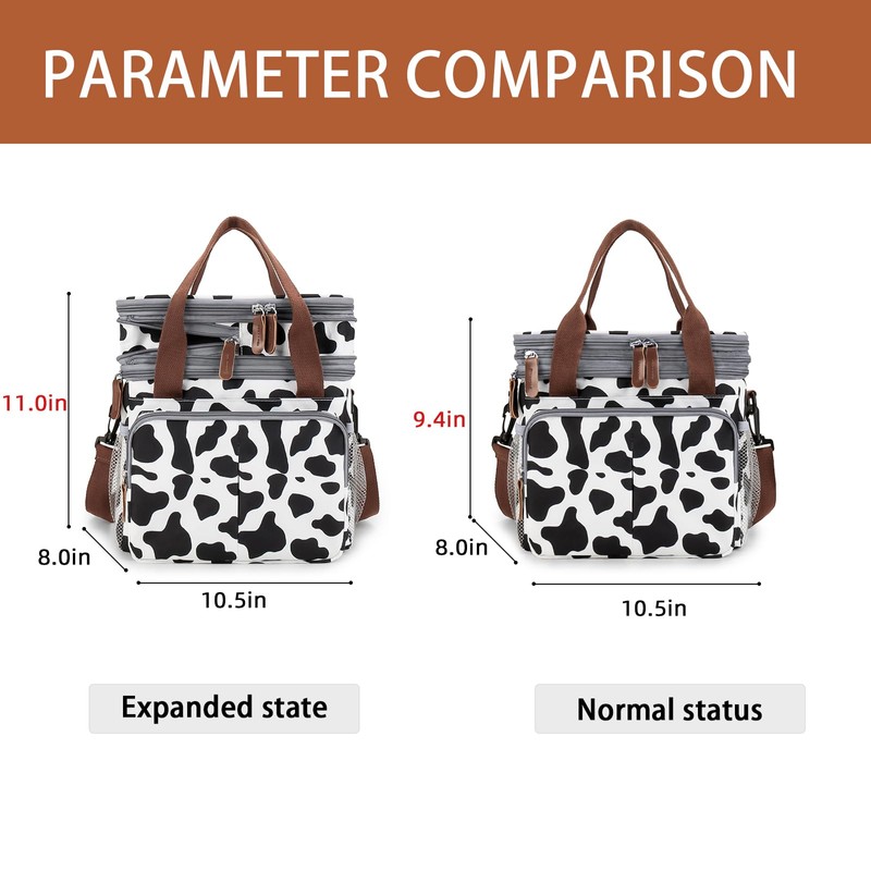 MOV COMPRA Lunch Bag for Women Men Double Deck Expandable Lunch Box,Large Lunch Bags,Leakproof Lunch Box Cooler Bag(Cow Print)