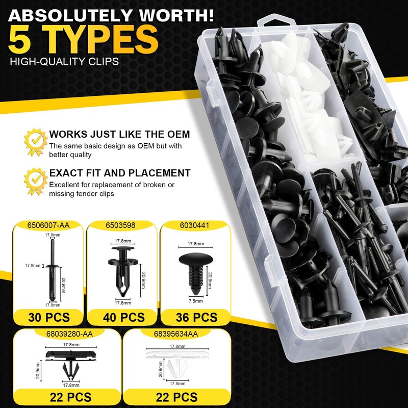 - COMPATIBLE CON LOS MODELOS JEEP WRANGLER: El kit de reemplazo de clips de guardabarros contiene 5 tipos de clips que se pueden utilizar para la parrilla delantera, cubierta superior del radiador, bengalas de guardabarros delantero y trasero, así como el módulo de alarma