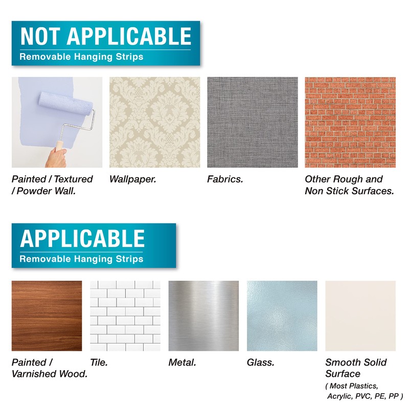- VERSATILE: These refill strips hold strongly on a variety of indoor surfaces including finished wood (painted or varnished shiplap, cabinets, or doors), laminate, glass, tile, metal, other smooth surfaces. Do Not Recommend to Use on Painted Walls or Picture Frames-use specially designed JELLYSUB Picture Hanging Strips or Hangers instead