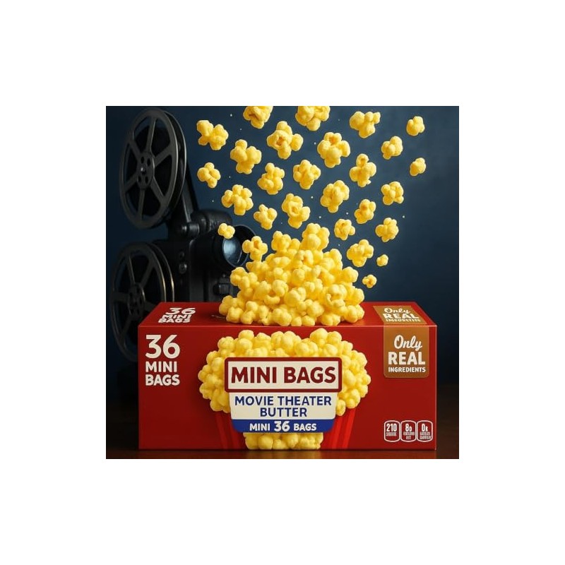 • 🍿 Rich Movie Theater Taste – Buttery flavor that brings the classic cinema experience to your home. Inspired by styles like Orville Redenbacher’s movie theater butter, with a rich aroma and satisfying crunch. 📦 36 Mini Bags – Single Serve – Includes thirty-six 1.5 oz microwave popcorn bags. Portion-controlled and easy to prepare. Great for quick snacks, movie nights, or lunchbox treats. 🥄 Simple Ingredients – Made with whole grain popping corn, palm oil, salt, and natural flavor. No artificial preservatives, flavors, or dyes. Just clean, crave-worthy popcorn.