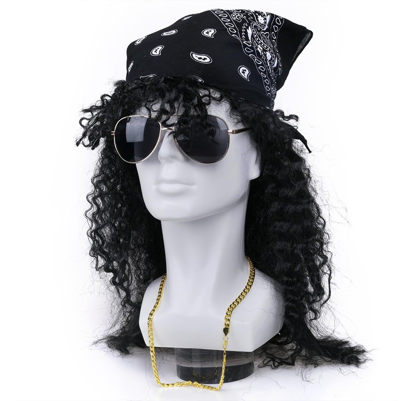 MOVINPE 80s Long Curly Wig for Men 80s Rocker Accessories Rockstar Wigs 1980s Mullet Wigs Headbands Sunglasses Leather Gloves Necklace (Long/Curly/Black)