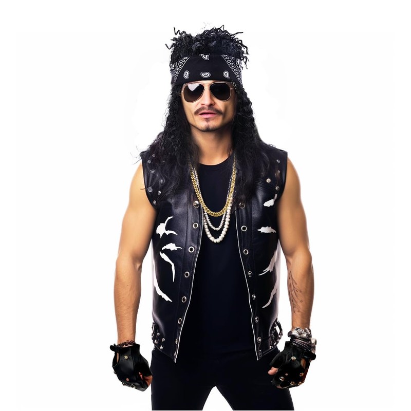 - 【80s Men Accessories】For a touch of 80s rock 'n' roll or street style, consider the 80s accessory: tie the paisley bandanas around your head, wrist, or neck. wear the oversized sunglasses with retro mirrored lenses, wear leather fingerless Gloves with rivets, chunky golden necklaces, and even a playful mustache. Each accessory is meticulously designed for durability and comfort, allowing you to transport yourself back to the vibrant world of the 1980s.