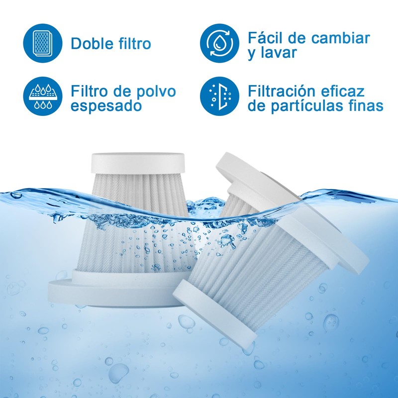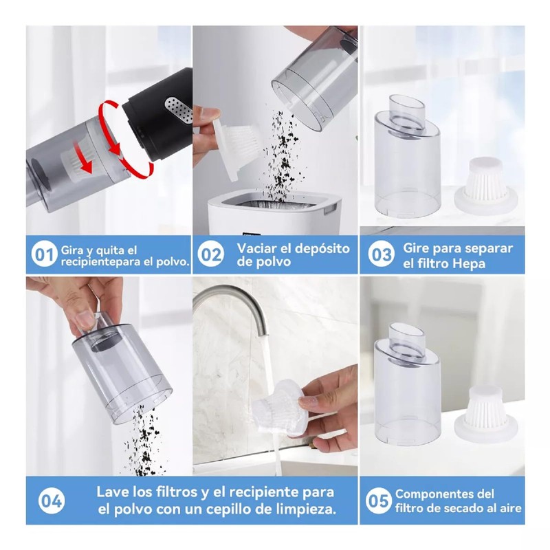 - Filtro HEPA Reutilizable: Aspiradora de mano está equipada con doble filtro lavable, bolsa de almacenamiento. El filtro HEPA puede filtrar eficazmente el polvo y las partículas finas para evitar la contaminación secundaria. La limpieza regular del filtro lavable evita la pérdida de succión y el bloqueo, y mantiene una buena succión