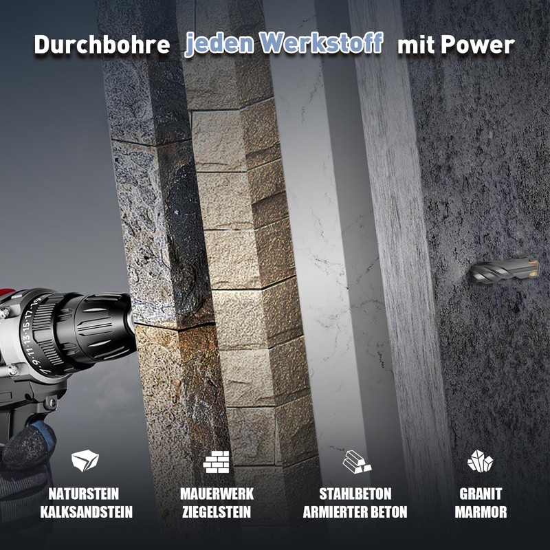 - For hard materials such as stone, concrete, natural stone, brick wall. Easily drill holes in ceilings, walls.