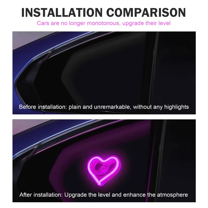 - Soft & Dazzling Glow: The heart-shaped neon emits a soft eye-catching glow that transforms your car’s interior. Its cool lighting and dynamic effects create a romantic, high-end vibe—perfect for dates, Valentine’s Day, or everyday drives. Elevate your car’s ambiance and add a touch of luxury with light that’s both striking and gentle on the eyes.
